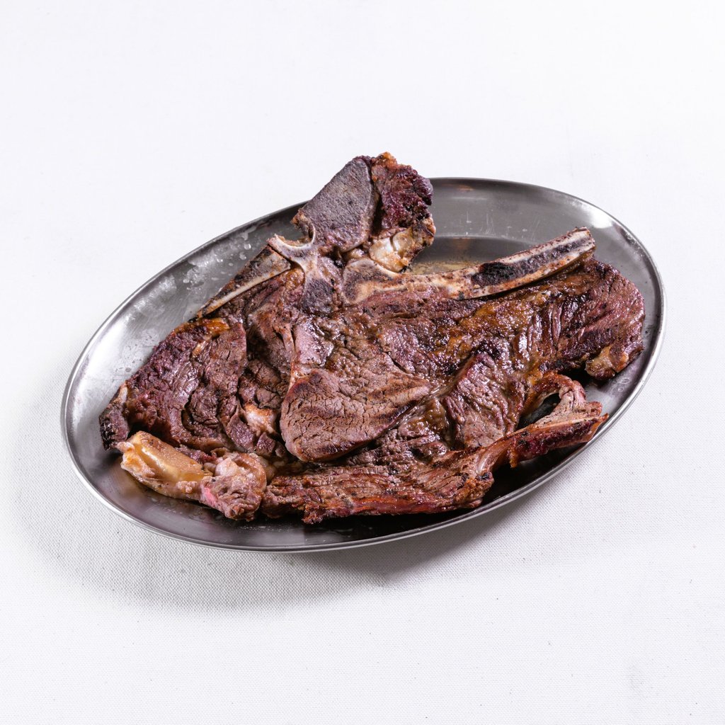 A autêntica costeleta de vaca, grelhada na brasa, acompanhado por guarnições à sua escolha.