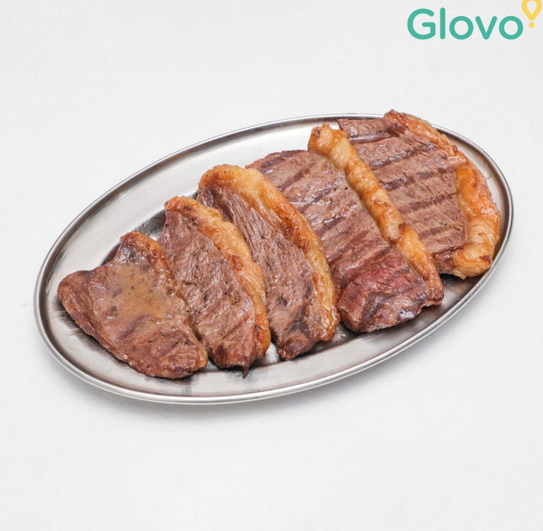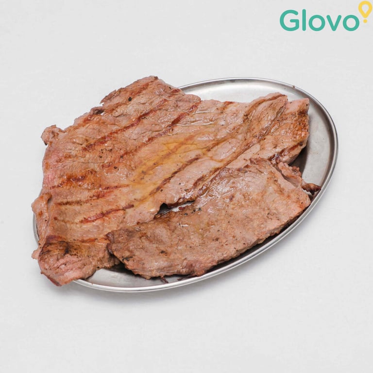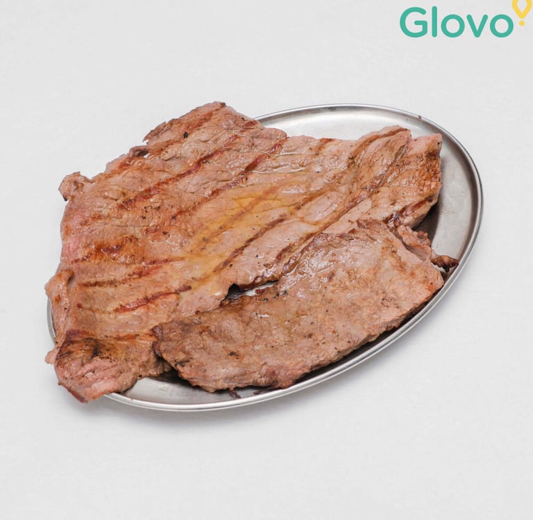 O delicioso churrasco de bife de vaca, muito bem temperado, com acompanhamentos à sua escolha.